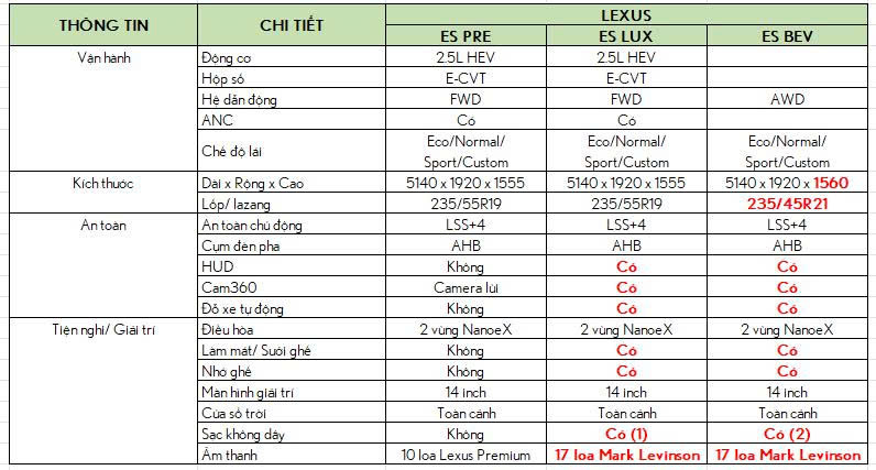 Tự hào là đại lý chính hãng của Lexus Việt Nam, Lexus Chính Hãng hiện đang phân phối các phiên bản ES350h Premium; ES350h Luxury & ES500e BEV với nhiều phong cách và nhu cầu sử dụng đáp ưng tối đa nhu cầu cá nhân hóa của Quý khách hàng yêu mến Lexus.